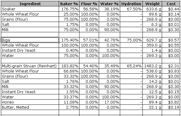 You can also see that overall salt is 1.76%, which is in the typical range for bread, but not as high as some at 2%. Finally, notice the overall cost of $2.31, dominated by the cost of the flour and honey (and milk). Note that I did not list a specific cost for the additional grains (because the term is rather ambiguous). If you would like to minimize your cost, you can get cheaper flour and honey or substitute them.