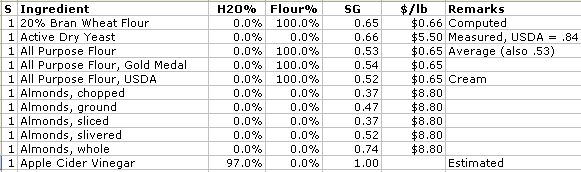 Several calculations made by the Dough Calculator spreadsheet require it to know some attributes of a particular ingredient. The “Lookup” worksheet contains a (long) list of ingredients with the necessary attributes. I call this the ingredients database.