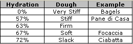 Each row starts with the lowest percentage hydration that characterizes that dough. All percentages up to that in the next row are included. For example: Soft dough has a hydration between 67% and 72%. You may edit/expand this table, but keep it sorted in order of increasing hydration percentage.
