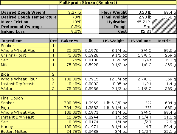 NOTE: When you do use a percent other than 0% and you are looking at the weights in the “Recipe” worksheet, remember that the weights have been (artifically) increased so the sum of flour weights shown will not equal, but be larger than, the computed flour weight (which does not include the overage).