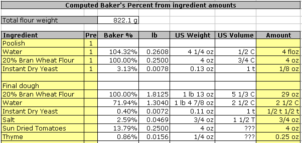 This example is for Dan Leader’s “Country Style Hearth Loaf with sun-dried tomatoes and thyme.” In most cases, I have entered the amount as specified in the original recipe (page 79). Note the use of various units, whether weights or volumes. The worksheet will accept both volume and weight measurements, but I suggest that if both are given, you use weights, as this will be most precise. Mixed use of weights and volumes within a single entry is not supported!