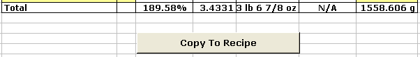 Here you will find the formula total percentage, total weight in decimal pounds, total weight in pounds and ounces, and total weight in grams. Below all this is a button that, when clicked, transfers all relevant information from this worksheet to the “Recipe” worksheet.